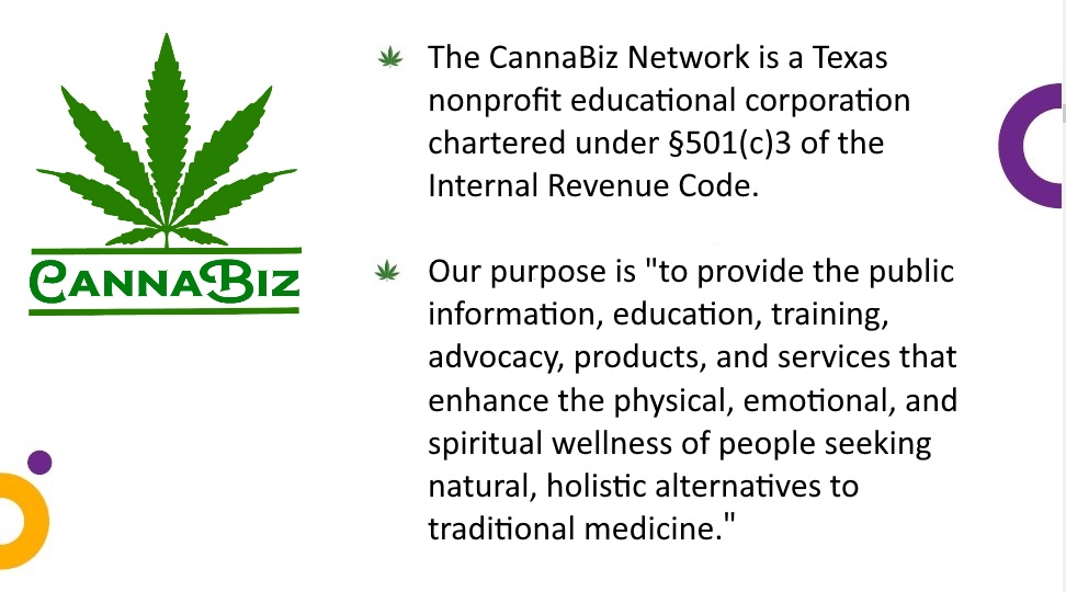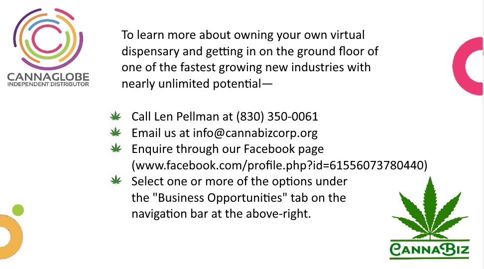 Please use the < and > arrows or the three gray dots (• • •) to navigate through the above presentation. If you have any questions, please email us at info@cannabizcorp.org or call (830) 350-0061. We are often out making presentations, so please leave a message if we do not answer.